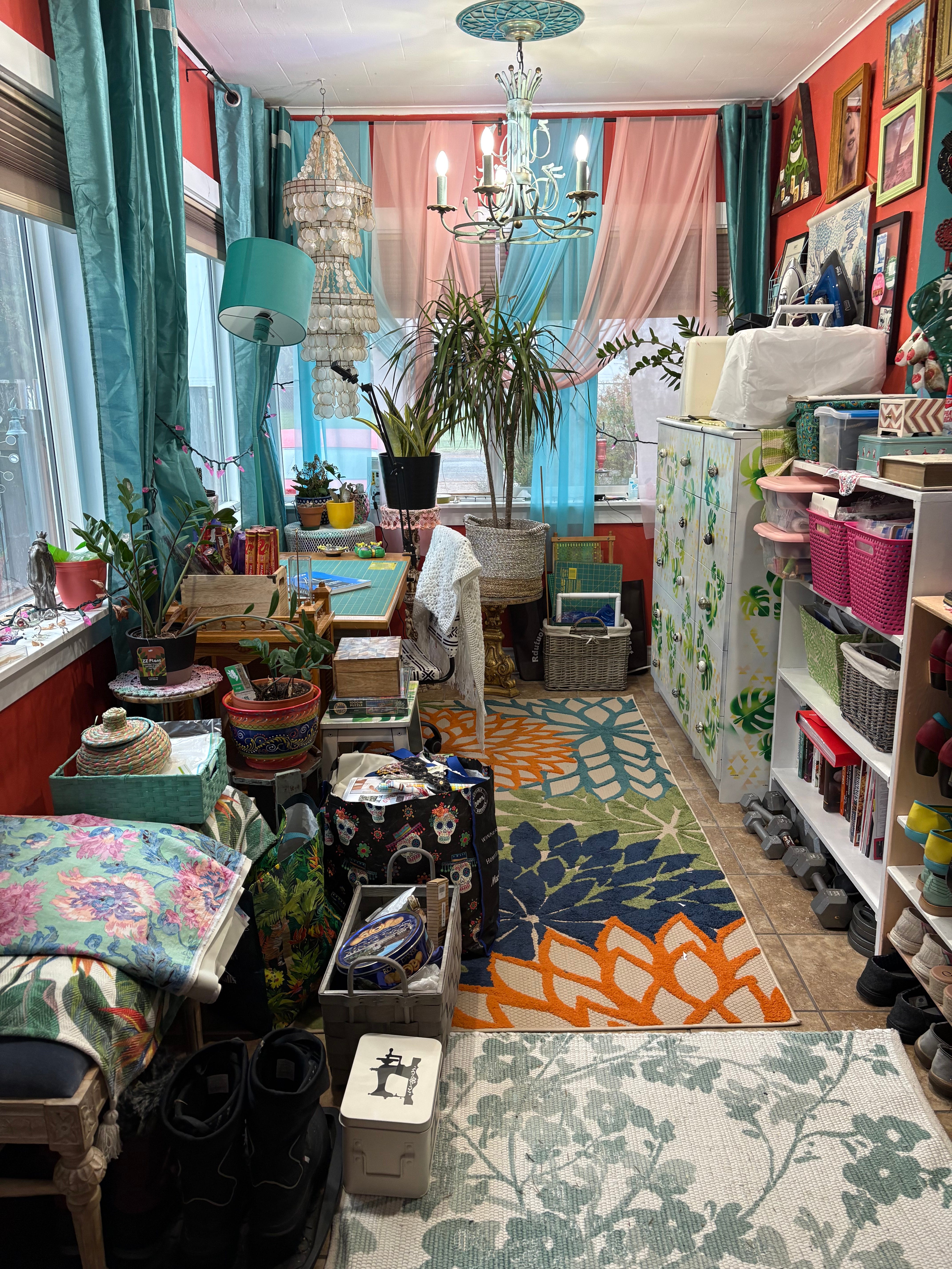 So, we have purposes for the nook (sewing), the family room (art studio and filming YouTube), kitchen and dining rooms (duh), the new synth cave, the master bedroom, and the living room.